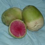 華北群の着色種で、外皮が淡い緑で内部が赤い。